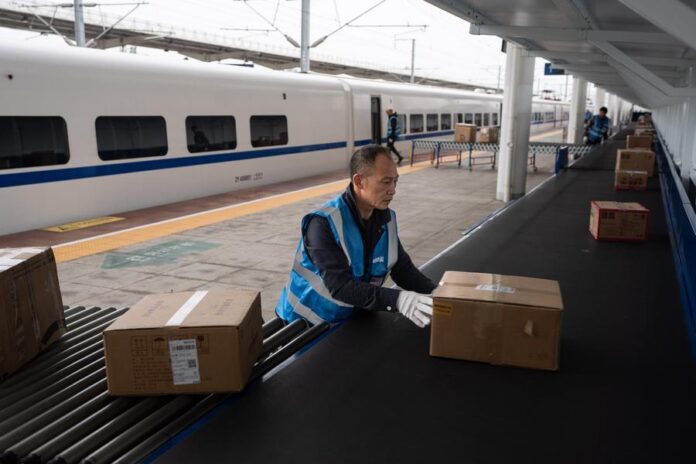 (แฟ้มภาพซินหัว : พนักงานขนย้ายพัสดุอีคอมเมิร์ซออกจากรถไฟหัวกระสุนที่สถานีรถไฟซวงหลิวตะวันตกในนครเฉิงตู มณฑลซื่อชวนทางตะวันตกเฉียงใต้ของจีน วันที่ 11 พ.ย. 2024)