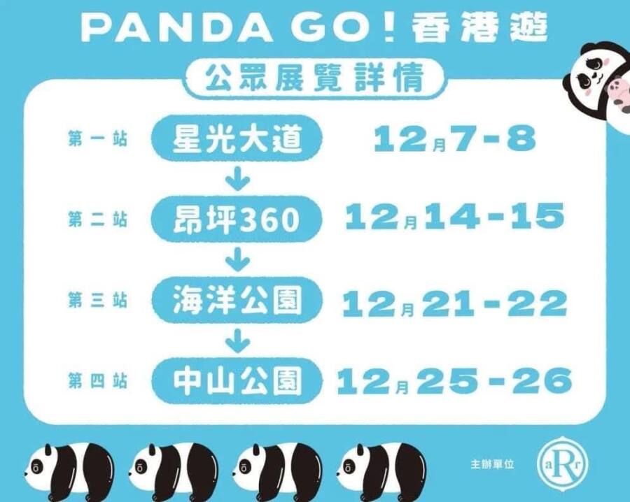 ตั้งแต่วันที่ 7 ธันวาคมเป็นต้นไป รูปปั้นแพนด้ายักษ์ทั้ง 2,500 ตัว จะจัดแสดงตามสถานที่สำคัญต่าง ๆ ในฮ่องกง เช่น