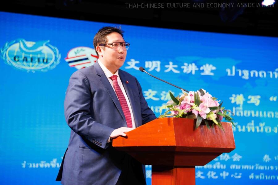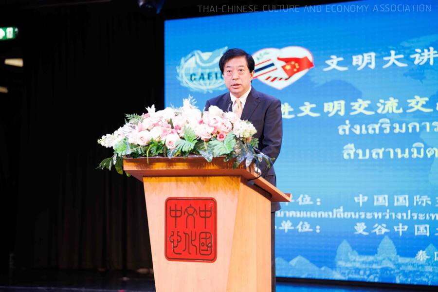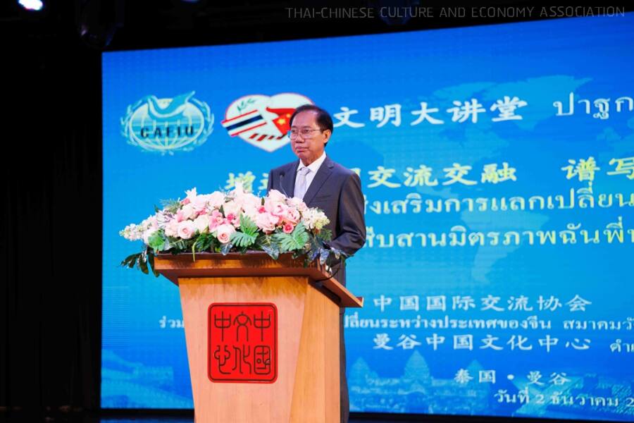 งานปาฐกถาพิเศษ เรื่อง ส่งเสริมการแลกเปลี่ยนและเรียนรู้อารยธรรม สืบสานมิตรภาพฉันพี่น้องจีน-ไทยสู่ยุคใหม่ เมื่อวันที่ 2 ธันวาคม 2567 ณ ศูนย์วัฒนธรรมแห่งประเทศจีน กรุงเทพฯ จัดโดย สมาคมวัฒนธรรมและเศรษฐกิจไทย-จีน ร่วมกับ Chinese Association for International Understanding (CAFIU) และสถานเอกอัครราชทูตสาธารณรัฐประชาชนจีน ประจำประเทศไทย