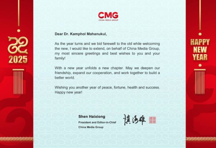 กิจกรรมสมาคมฯ นายเซิ่น ไห่สง CMG ได้ส่งบัตรอวยพรเนื่องในโอกาสเทศกาลปีใหม่สากล 24 ธันวาคม 2024 57 FacebookTwitterWhatsAppTelegramLINE นายเซิ่น ไห่สง ผู้อำนวยการใหญ่ ไชน่ามีเดียกรุ๊ป (China Media Group หรือ CMG ) ได้ส่งบัตรอวยพรเนื่องในโอกาสเทศกาลปีใหม่สากล 2025 แก่ นายกำพล มหานุกูล นายกสมาคมผู้สื่อข่าวไทย-จีน