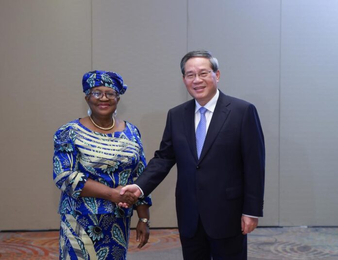 (แฟ้มภาพซินหัว : หลี่เฉียง นายกรัฐมนตรีจีน พบปะกับเอ็นโกซี โอคอนโจ-อิเวียลา ผู้อำนวยการใหญ่องค์การการค้าโลก ในเมืองรีโอเดจาเนโรของบราซิล วันที่ 7 ก.ค. 2025)