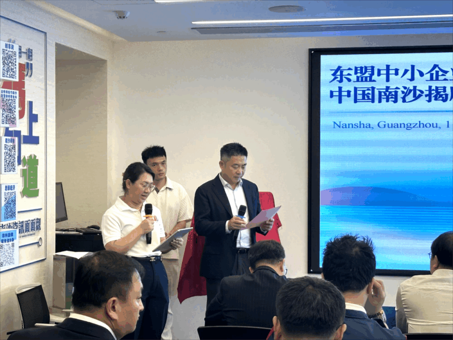 พิธีนี้ดำเนินรายการโดยนางเซี่ย เสี่ยวฮุ่ย รองประธานการประชุมปรึกษาการเมืองของเขตหนานซาและผู้อำนวยการสำนักพาณิชย์เขตหนานซา โดยมีผู้นำหลายท่านเข้าร่วมในงานอย่างพร้อมเพรียง นายเฉิน เจี๋ยเคอ ประธานสมาคมพัฒนาวิสาหกิจขนาดกลางและขนาดย่อมด้านเศรษฐกิจและการค้า อาเซียน (ASEAN SME Economic & Trade Association) และนายเซี่ย เว่ย รองเลขาธิการคณะกรรมการประชาชนเทศบาลนครกว่างโจว รองเลขาธิการพรรคคณะกรรมการเขตพัฒนาเขตเศรษฐกิจและเทคโนโลยีหนานซา (เขตการค้าเสรีหนานซา) และรองผู้อำนวยการคณะกรรมการบริหาร ร่วมกันเปิดป้ายสำนักงานอย่างเป็นทางการ