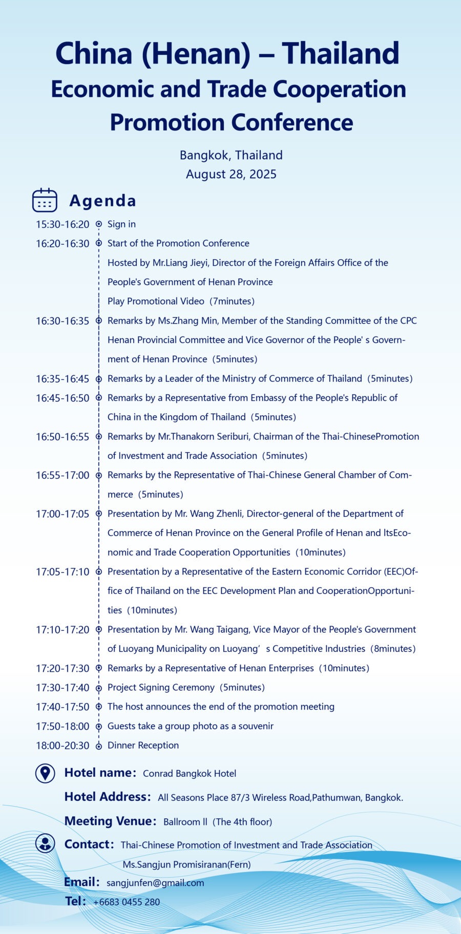 เหอหนาน เดินทางมาเยือนไทยและจะจัดงานสัมมนา “การส่งเสริมความร่วมมือด้านเศรษฐกิจและการค้าจีน (เหอหนาน)-ไทย” ในวันที่ 28 สิงหาคม 2568 เวลา 15.30-18.00 น. ณ โรงแรมคอนราด กรุงเทพฯ รายละเอียดกำหนดการและลิงค์ลงทะเบียนตามด้านล่าง ซึ่งไม่มีค่าใช้จ่ายในการเข้าร่วมงานดังกล่าว