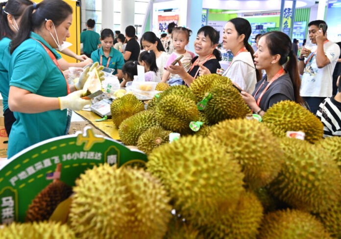 (แฟ้มภาพซินหัว : ผู้คนเลือกซื้อทุเรียนมาเลเซียที่งานแสดงสินค้าจีน-อาเซียน ครั้งที่ 21 ในเมืองหนานหนิง เขตปกครองตนเองกว่างซีจ้วงทางตอนใต้ของจีน วันที่ 28 ก.ย. 2024)