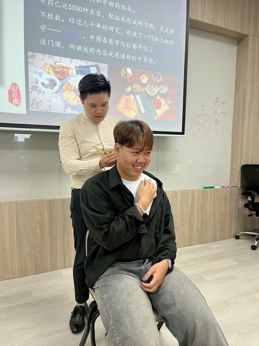 นอกจากนี้ยังมีกิจกรรมให้ผู้เรียนได้สัมผัสศาสตร์แพทย์แผนจีนอย่างใกล้ชิด อาทิ การสาธิต “กัวซ่า” (刮痧) เพื่อบรรเทาอาการปวดเมื่อย การสัมผัสชีพจรเพื่อเรียนรู้ตำแหน่งจุดสำคัญในร่างกาย รวมถึงการอภิปรายแลกเปลี่ยนความคิดเห็นเกี่ยวกับประเภทของอาหารที่มีฤทธิ์ “ร้อน–เย็น” ตามหลัก หยิน–หยาง (阴阳) เพื่อสร้างความเข้าใจในแนวคิดสมดุลของร่างกาย ซึ่งเป็นหัวใจสำคัญของการดูแลสุขภาพในแนวทางจีน