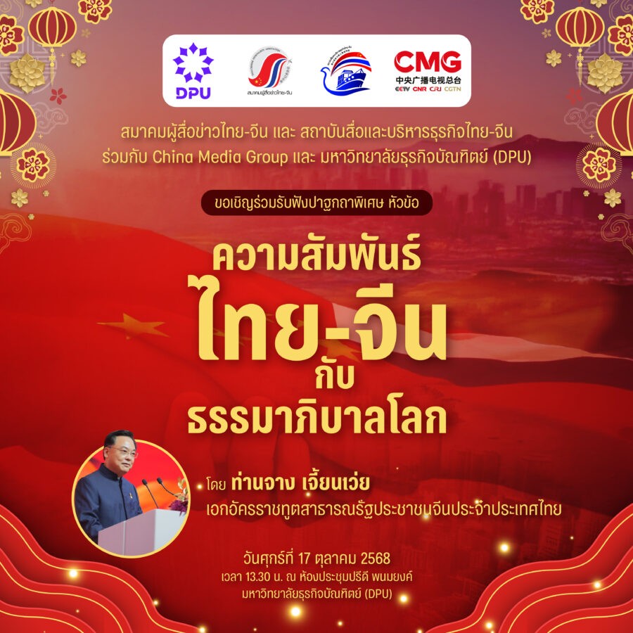ในโอกาสนี้ สมาคมผู้สื่อข่าวไทย–จีน ขอเชิญชวนผู้สนใจเข้าร่วมงานปาฐกถาพิเศษ เนื่องในโอกาสครบรอบ 50 ปี ความสัมพันธ์ทางการทูตไทย–จีน ซึ่งจะจัดขึ้นในวันศุกร์ที่ 17 ตุลาคม 2568 เวลา 13.30 น. ณ ห้องประชุมปรีดี พนมยงค์ อาคารเฉลิมพระเกียรติ มหาวิทยาลัยธุรกิจบัณฑิตย์ (DPU) ภายใต้หัวข้อ “ความสัมพันธ์ไทย–จีน กับธรรมาภิบาลโลก”