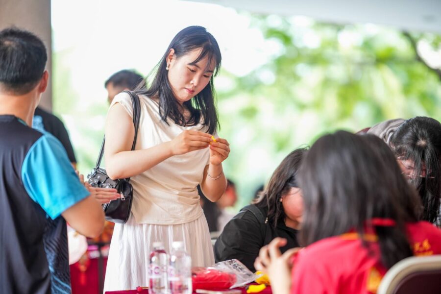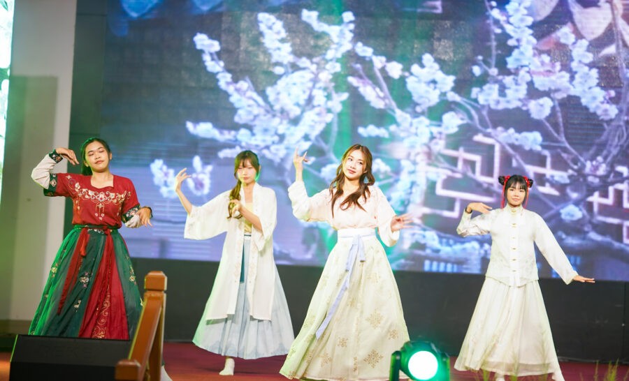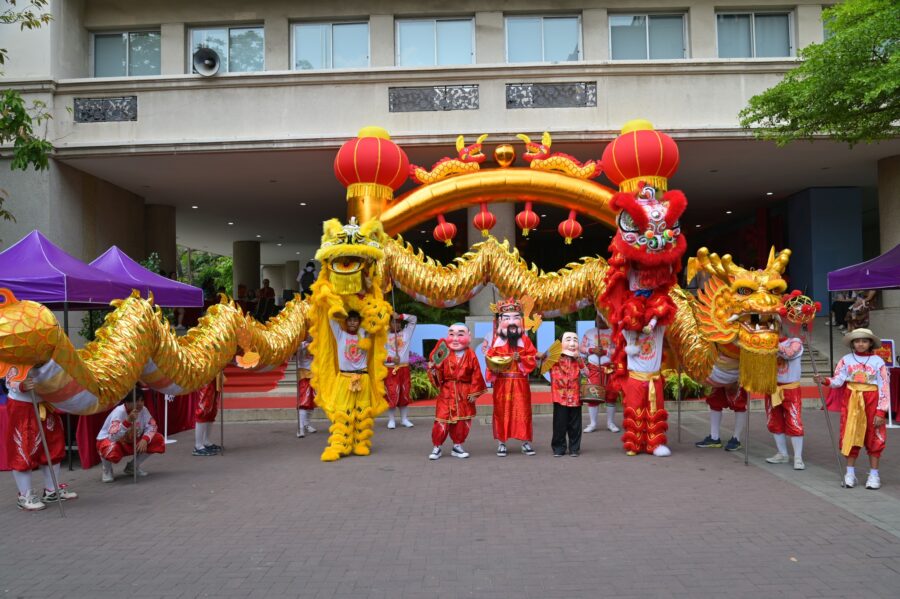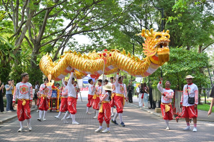บรรยากาศภายในงานเต็มไปด้วยความคึกคักและอบอุ่น เริ่มตั้งแต่ช่วงเช้ากับโซนบูธวัฒนธรรมจีน–ไทย ณ อาคาร 7 ชั้น 1 เปิดโอกาสให้ผู้เข้าร่วมได้สัมผัสกิจกรรมเชิงวัฒนธรรมอย่างใกล้ชิด ไม่ว่าจะเป็นการเขียนพู่กันจีน การตัดกระดาษจีน การระบายสีหน้ากากงิ้ว การชงชา การละเล่นโบราณ และการแต่งกายชุดประจำชาติ จากนั้นช่วงเที่ยงมีขบวนแห่มังกร–สิงโต บริเวณถนนสายกลางภายในมหาวิทยาลัย สร้างสีสันและความเป็นสิริมงคลให้กับผู้ร่วมงาน