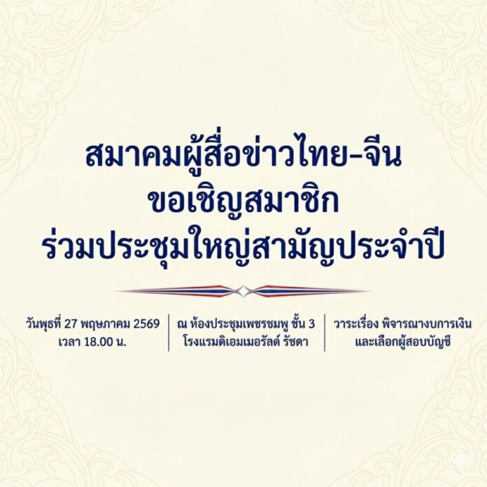 สมาคมผู้สื่อข่าวไทย-จีน ขอเชิญสมาชิก ร่วมประชุมใหญ่สามัญประจำปี